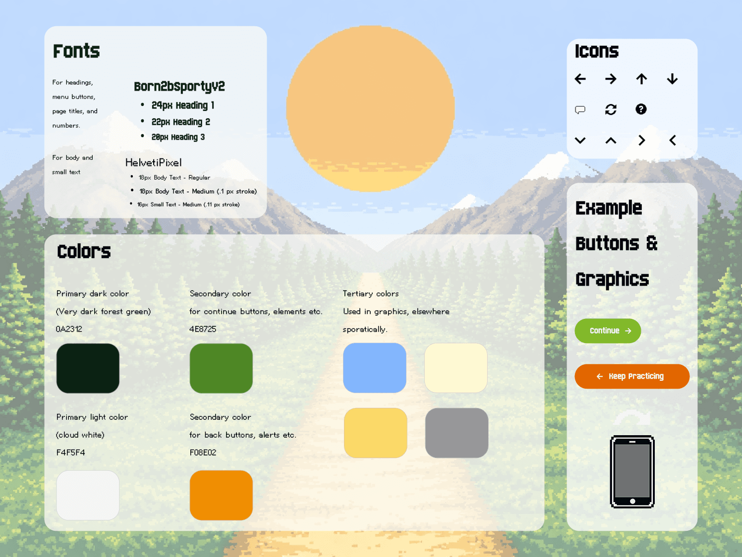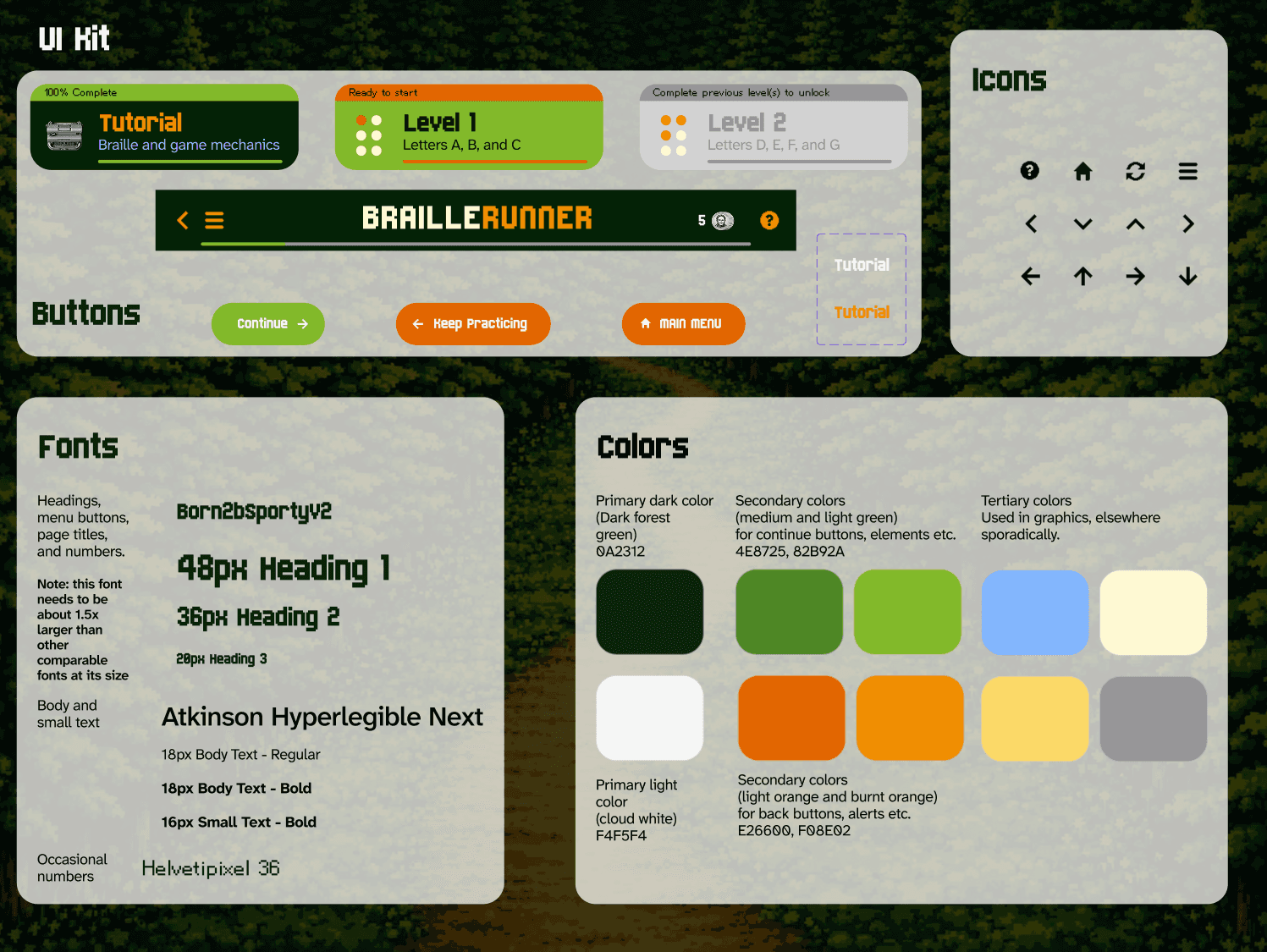 Our final UI kit expands upon the style guide, including revised fonts, colors, our full library of hero character assets, as well as additional icons, components, and graphics.