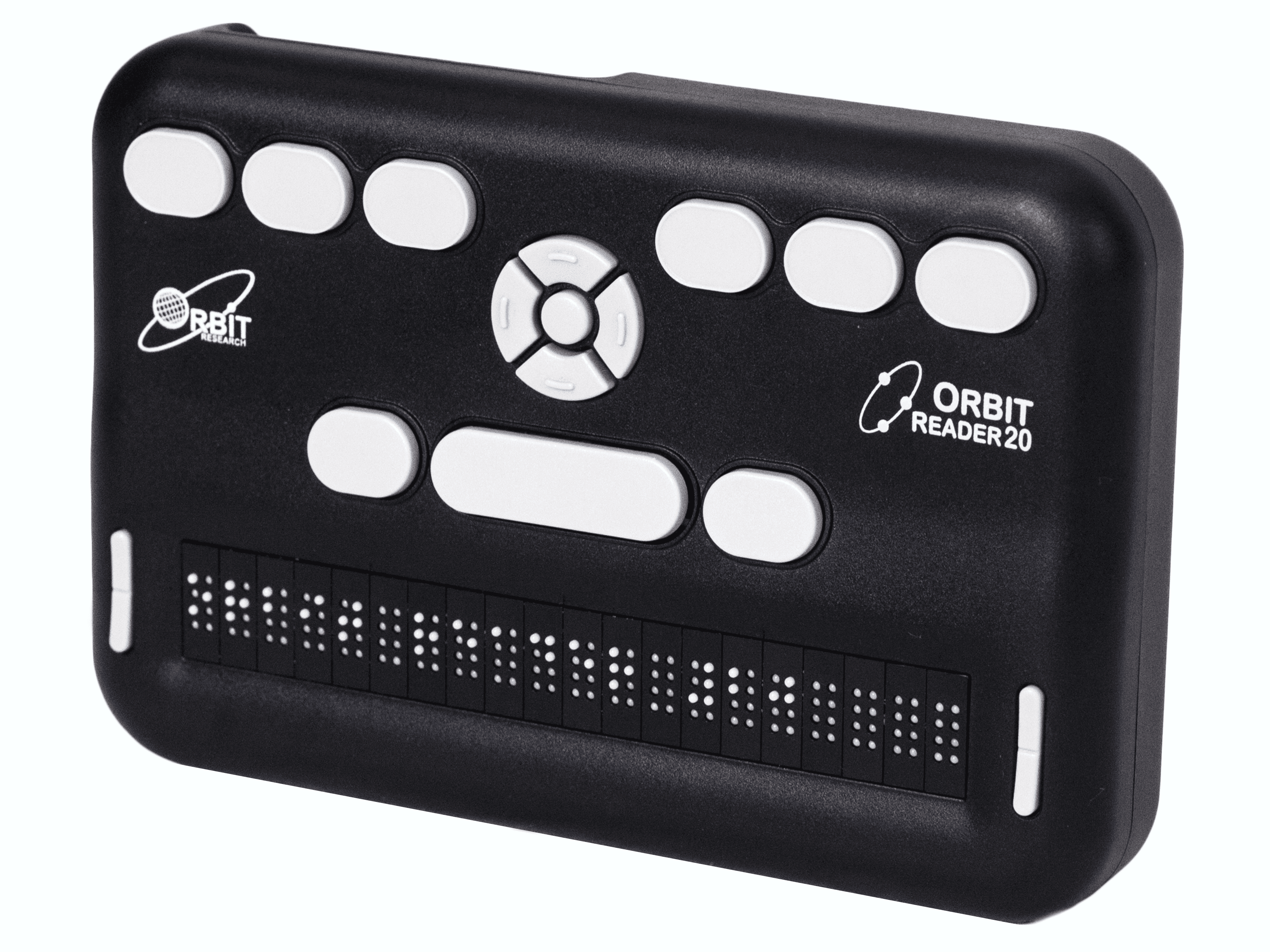 A modern, affordable Bluetooth Braille display by Orbit Research. The two sets of three top buttons mirror the Perkins input keys.