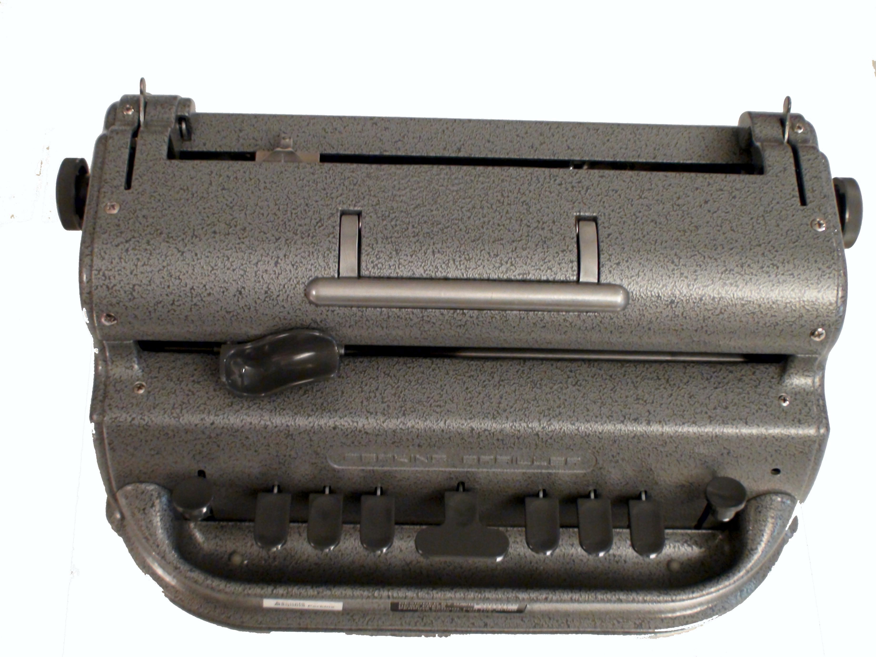 Invented in the early 1950s, the Perkins Braille typewriter is still widely used today. The two sets of three keys surrounding the center button are used to type individual letters.
